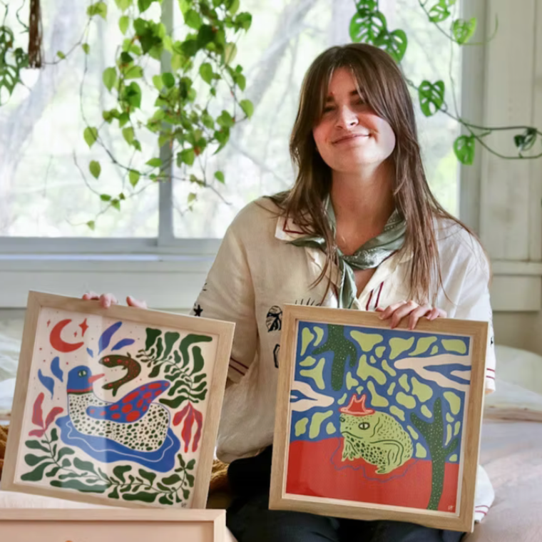 Dayna Walton is the artist behind Solstice Handmade. Her illustrations and prints are often inspired by the creepy crawly, the slimy, the overlooked, the in-between stages of growth and decomposition, beginnings and endings. Having studied Printmaking at Kendall College of Art and Design in Michigan, Dayna now works in a home studio where she and her partner use silkscreens to turn ink drawings into prints. She often collaborates with other craftspeople like sewers, dyers, and leatherworkers to make unique functional goods from printed textiles and paper.